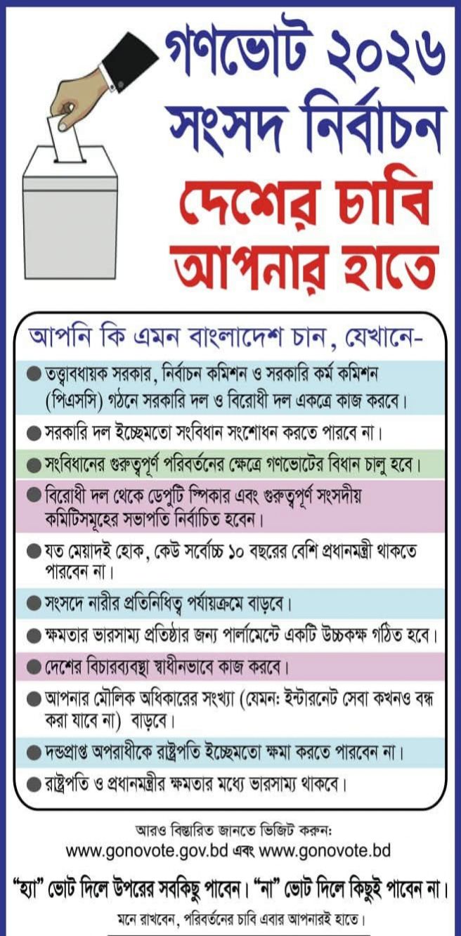 গণভোট-২০২৬ সংসদ নির্বাচন - দেশের চাবি আপনার হাতে। পরিবর্তনের জন্য "হ্যাঁ" , মনে রাখবেন "হ্যাঁ" ভোটই পারে পরিবর্তন আনতে।